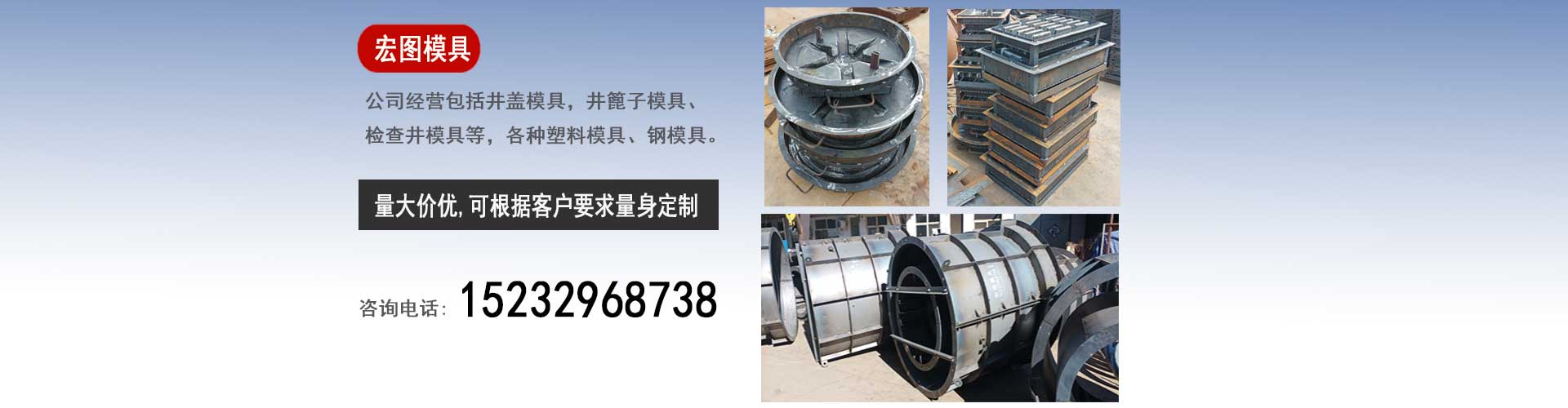保定宏圖檢查井蓋模具廠是一家集設(shè)計(jì)、研發(fā)、生產(chǎn)、銷售為一體的企業(yè),我廠主要經(jīng)營:水泥井蓋模具,預(yù)制井蓋塑料模具,下水井蓋鋼模具,雨水井篦子模具,排水井篦子塑料模具,污水井篦子鋼模具,混凝土檢查井模具,污水檢查井鋼模具等。我廠的賣的不僅僅是模具,更是一份保障,一份誠信,一份放心,我廠的銷售宗旨是"以誠信為本,做最好的模具,賣最便宜的價(jià)格"。保定宏圖檢查井蓋模具廠的模具產(chǎn)品銷往全國的30多個(gè)省市區(qū)及海外受到了廣大用戶的好評。